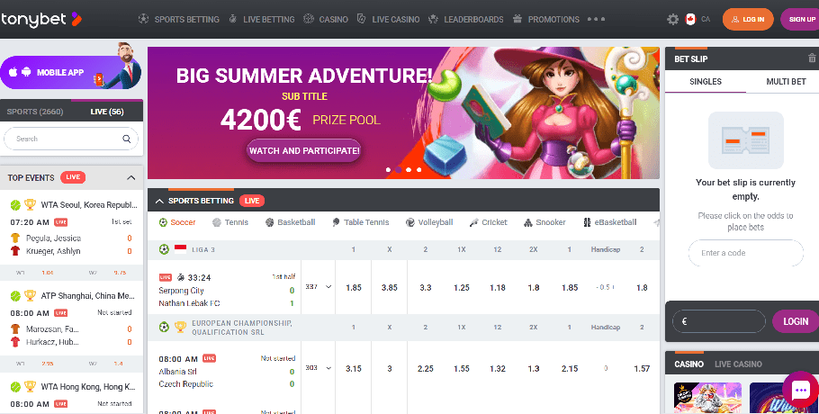 Prematch and in-play markets are available for major and minor events in more than 20 sports, including football, tennis, basketball, ice hockey, and more, if you enjoy sports betting. You may wager on Esports at TonyBet, including Counter-Strike, Dota 2, Starcraft, and other games.
