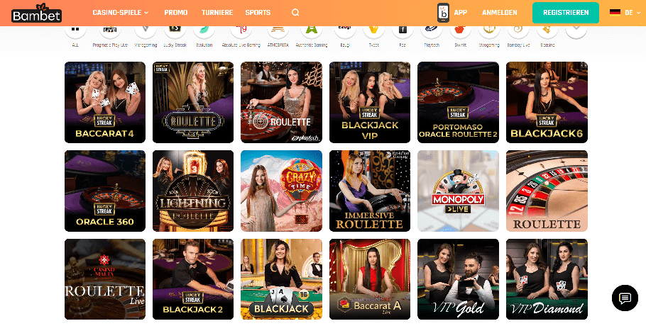Bambet bietet ein Live-Casino-Erlebnis mit über 280 Lobbys und bietet Live-Dealer-Spiele wie Blackjack, Baccarat, Roulette, Sic Bo und mehr. Diese Spiele werden von Live-Dealern für eine realistische Spielumgebung angeboten.