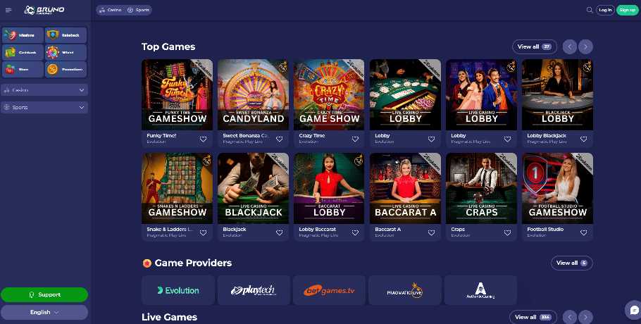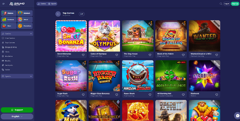 Brunos Spielesammlung ist recht standardisiert und bietet eine große Auswahl, die den Vorlieben der meisten Menschen gerecht wird. Book of Dead, Sweet Bonanza, Break da Bank, Reactoonz, Wolf Gold, Fire Joker und Mega Moolah sind nur einige der Spielautomaten, die Spielern Jackpots von insgesamt mehr als 2 Milliarden US-Dollar beschert haben. Zu den weiteren Spielen außerhalb von Bingo und Keno gehören Rubbellose, Plinko, Aviator und Bingo. Sie können auch Wetten auf eine Vielzahl anderer Tischspiele und Fernsehsendungen platzieren, darunter Craps, Dragon Tiger, Dream Catcher, Double Ball oder Lightning Roulette, Sic Bo, Deuces Wild, Caribbean Poker, Atlantic City Blackjack und viele mehr. Die meisten Spiele bieten eine kostenlos spielbare Version, Sie können sie also ausprobieren, bevor Sie einen Echtgeldeinsatz tätigen.