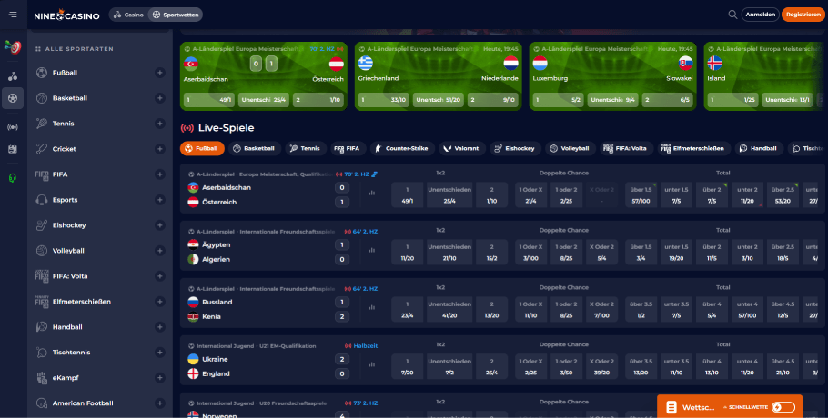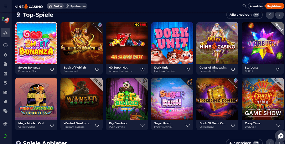 Casino Nine bietet eine große Auswahl an Spielen, darunter Video-, Jackpot- und Megaways-Slot-Spiele wie „Chilli Heat“, „Sweet Bonanza“ und mehr. Es gibt auch eine Auswahl an Tischspielen wie Poker, Roulette, Blackjack und mehr. Für die meisten Spiele stehen den Spielern Testversionen zum Testen zur Verfügung.