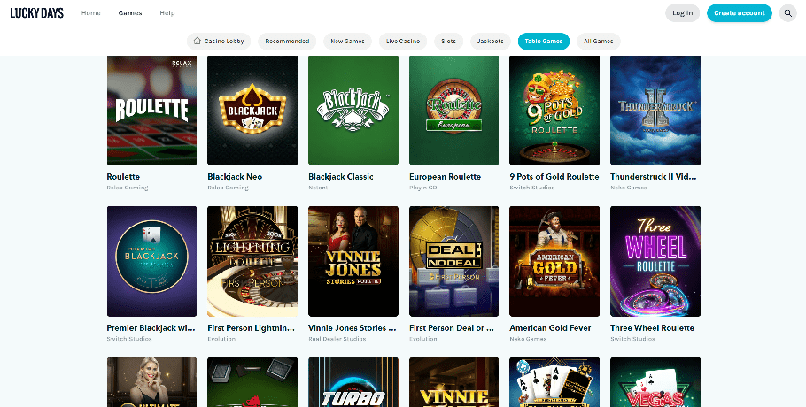 Lucky Days Casino tarjoaa erilaisia pöytäpelejä, kuten rulettia, blackjackia, pokeria ja videopokeria. Baccarat puuttuu kuitenkin merkittävästi pöytäpelien valikoimasta. Baccaratista kiinnostuneiden pelaajien tulee vierailla Live Casino -osiossa vaihtoehtoja, kuten Ultimate Texas Hold'em, Caribbean Stud, Roulette, Live Dragon Tiger ja paljon muuta.