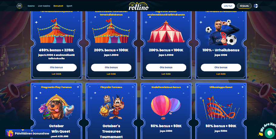 Rekisteröityneet käyttäjät voivat lunastaa 50 %:n uudelleenlatausbonuksen aina 300 euroon asti ja 50 ilmaispyöräytystä maanantaista torstaihin. Weekend Boost -bonus on 50 % 500 € asti plus 50 ilmaispyöräytystä, voimassa perjantaista sunnuntaihin. Rollino Casinon viikoittainen Cashback on 500 € asti, ja siinä on 20-kertainen kierrätysvaatimus. Asiakaspalvelu neuvoi meitä chatin kautta, että voit saada prosenttiosuuden nettotappioistasi kaikista peleistä, et vain kolikkopeleistä. VIP-statusi määrittää ansaitsemasi prosenttiosuuden, joka vaihtelee 10 %:sta pronssijäsenille 25 %:iin platinajäsenille.