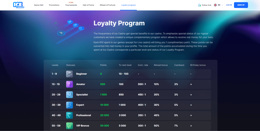 Ice Casino offers weekly cashback to regular customers of up to ā¬2000, with a five-time wagering minimum. The percentage of cashback you receive depends on your loyalty program level, which has 10 tiers. You earn 1 point for every ā¬10 wagered, and program participation comes with benefits such as improved exchange rates, higher cashback percentages, cash bonuses, and more.
