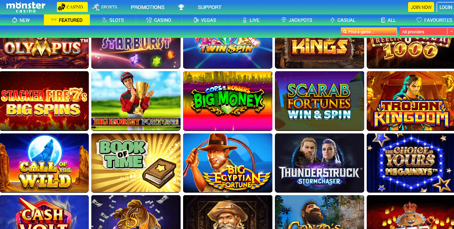 Monster Casino offers more than 3000 game selections, and these games are neatly divided into categories such as New, Featured, Slots, Casino, Live, Jackpots, Casual, and All.