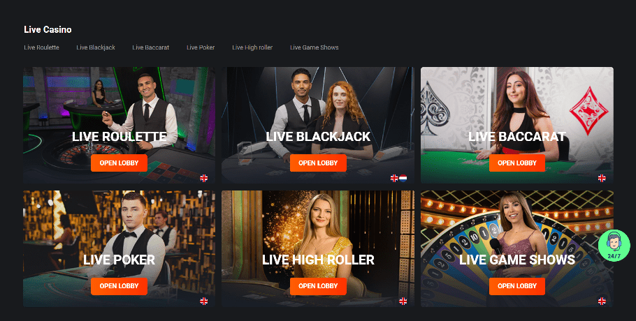 - Live dealer games are available