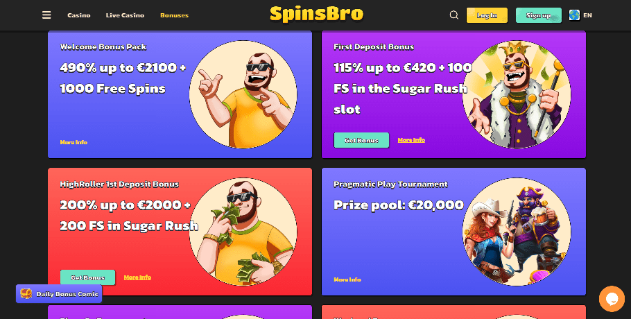 SpinsBro lists a variety of daily bonus offers under Promotions, including deposit match bonuses, bonus cashback, and bonus spins. Participants in SpinsBro Tournaments are invited to compete for a prize pool of Bro Coins. There are different terms and conditions and wagering requirements. There are maximum wager limitations and a vast list of bonus-excluded games that are applicable, in no particular order. Always make sure the terms are appropriate before participating in online casino promotions.